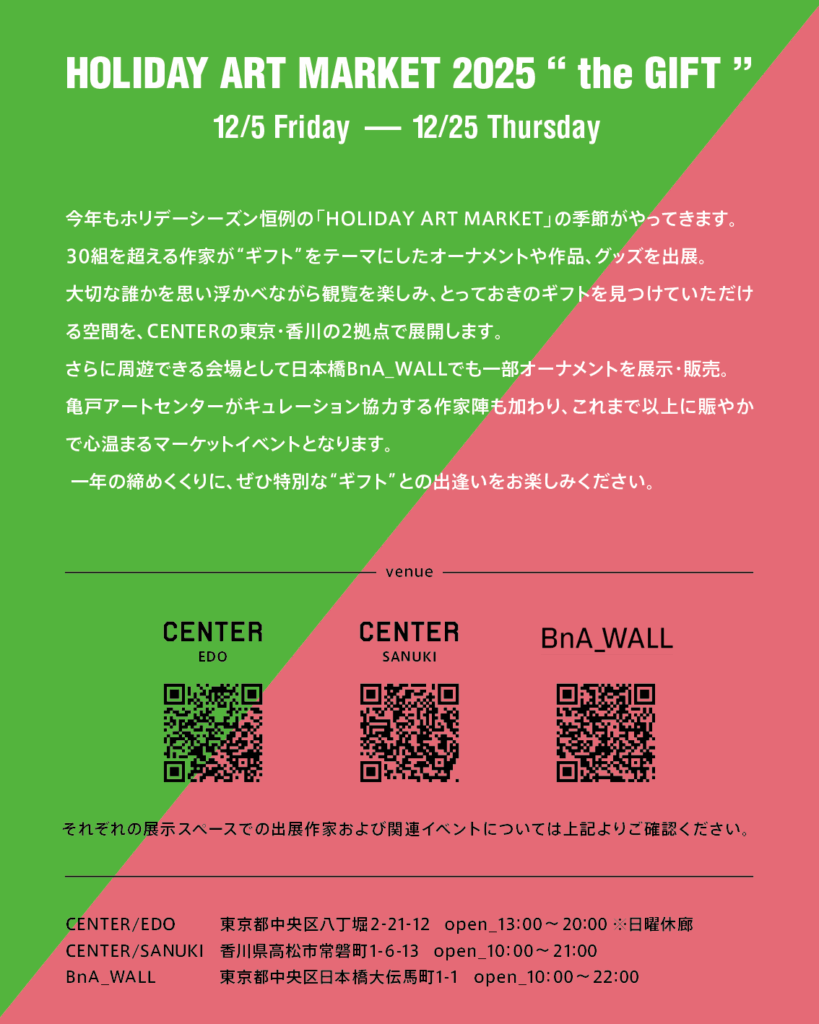 30組を超えるアーティストが“ギフト“をテーマにしたオーナメントや作品、グッズを出展。大切な誰かを思い浮かべながら観覧を楽しみ、とっておきのギフトを見つけていただける空間を、CENTERの東京・香川の2拠点で展開します。さらに周遊できる会場として日本橋BnA_WALLでも一部オーナメントを展示・販売。亀戸アートセンターがキュレーション協力する作家陣も加わり、これまで以上に賑やかで心温まるマーケットイベントとなります。